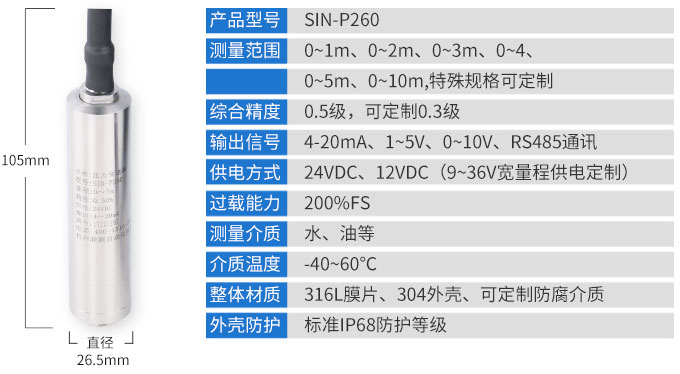 SIN-P260投入式液位變送器SIN-P260投入式液位變送器由高性能擴(kuò)散硅壓阻式壓力傳感器作為測(cè)量元件,把與液位深度成正比的液體靜壓力準(zhǔn)確測(cè)量出來,并經(jīng)過信號(hào)調(diào)理電路轉(zhuǎn)換成標(biāo)準(zhǔn)(電流或電壓)信號(hào)輸出,建立起輸出信號(hào)與液體深度的線性對(duì)應(yīng)關(guān)系,實(shí)現(xiàn)對(duì)液體深度的測(cè)量。產(chǎn)品精度高、體積小,直接投入液體中,即可測(cè)量出變送器末端到液面的液體高度,使用方便。適用于石油、化工、電廠、城市供水、水文勘探領(lǐng)域的液位測(cè)量與控制。經(jīng)過長期老化及穩(wěn)定性篩選,產(chǎn)品性能穩(wěn)定可靠,能夠適用應(yīng)用于環(huán)境比較惡劣的露天現(xiàn)場(chǎng),同時(shí)能夠現(xiàn)場(chǎng)液位顯示,零點(diǎn),滿程可遷移。